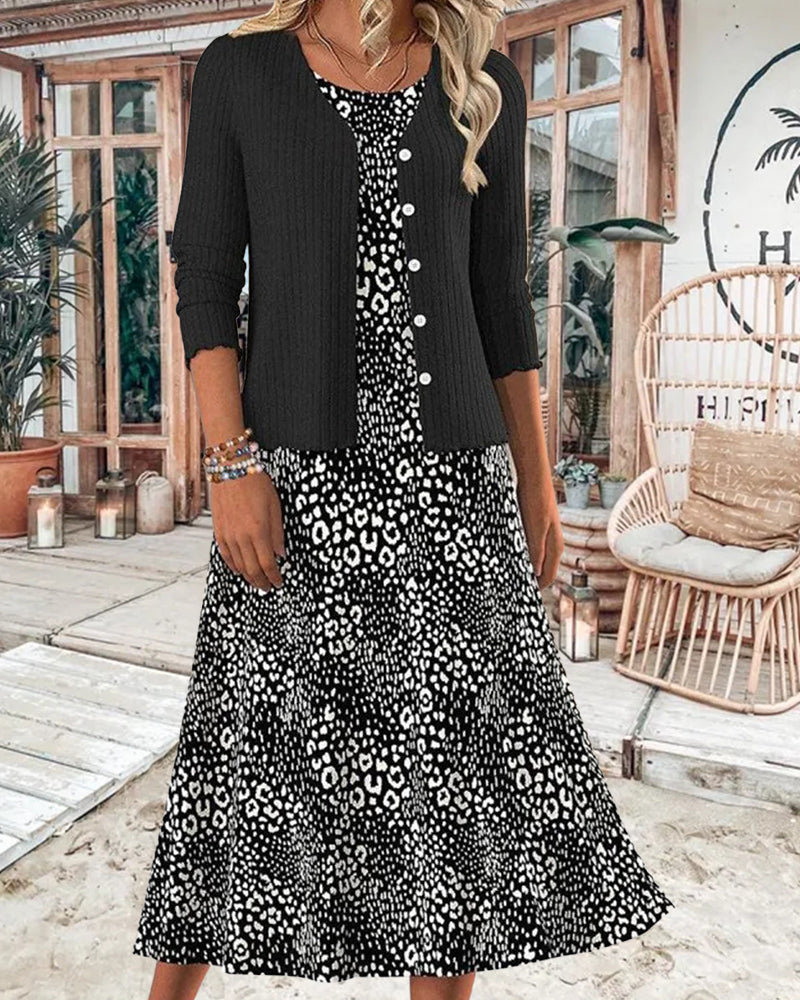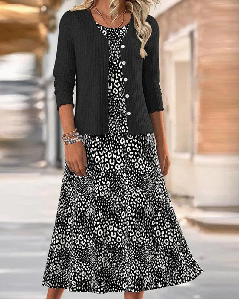 Zwei-Teiliges Set Mit Geripptem Cardigan Und Leopardenmusterter Ärmelloser Kleid