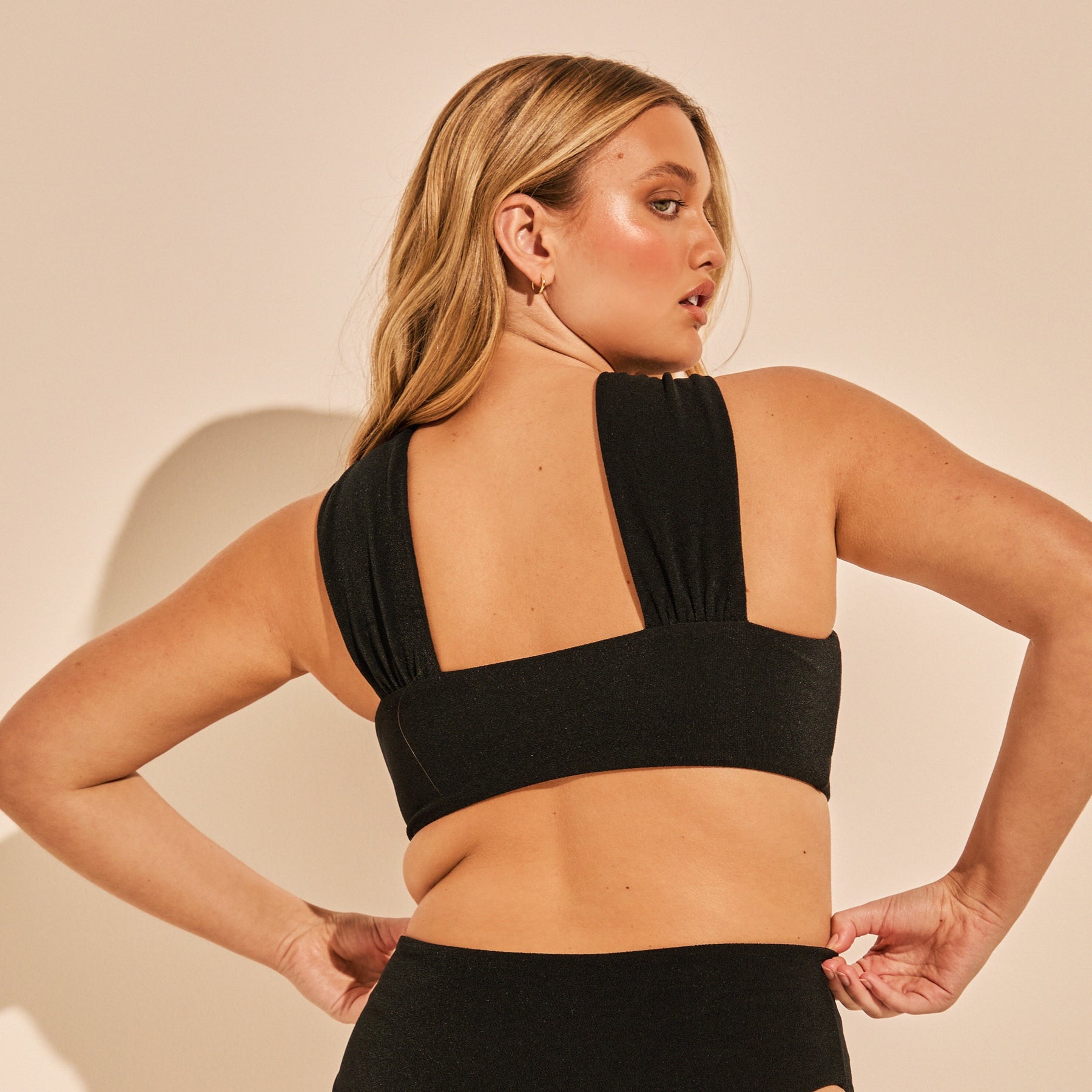 This piece is entirely seamless with a cross-halter neck, keyhole front, and wide straps to the back. It features a bust support system with a hidden underwire and soft elastic, so it's perfect for larger bust sizes. It has been crafted from premium Italian micro-terry textured fabric. You won't stop smiling while wearing it.